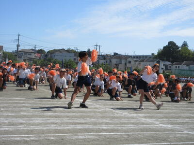 応援合戦の一番手は赤組から。どのカラーも工夫された隊形移動や振り付け、見事にそろった気迫あふれるかけ声。子ども達の懸命に頑張っている姿には、見る側も吸い込まれていきます。何よりも、仲間とこうして応援を創り上げることの楽しさを、身体全体で表現する子ども達!!