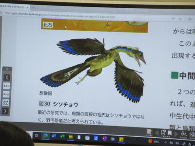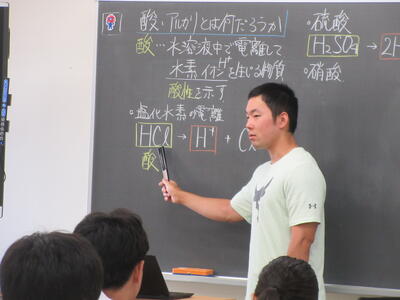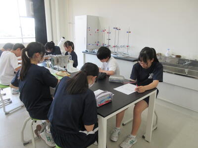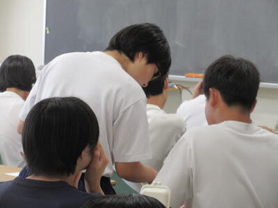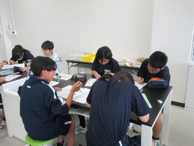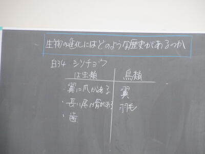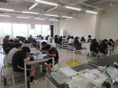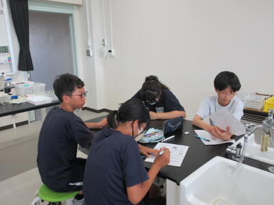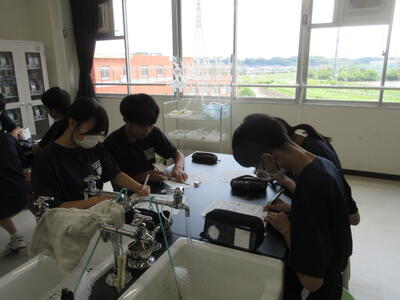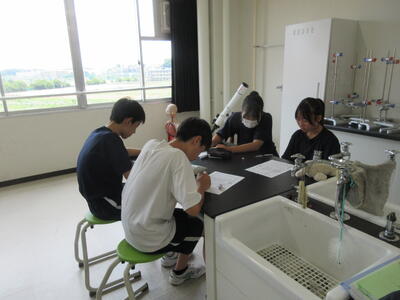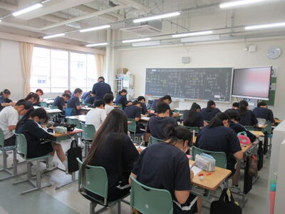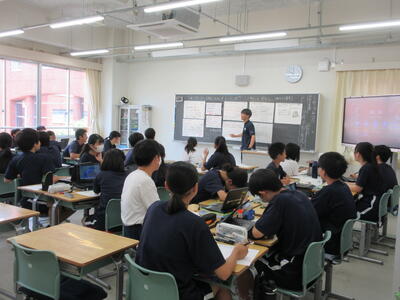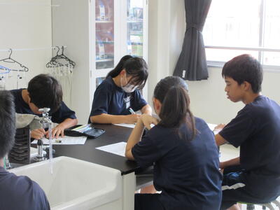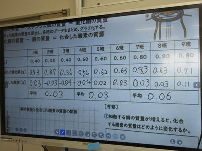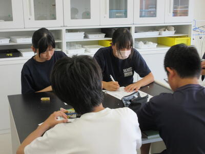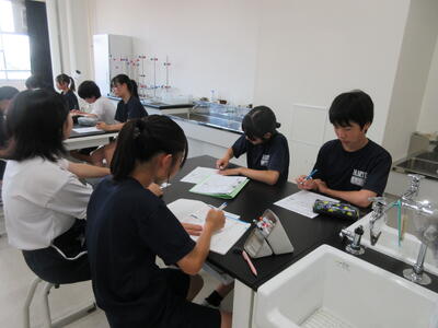 ▼1年生理科の授業。実験結果についてグループごとにしっかりと言葉に出して考察し、まとめ、発表していきます。