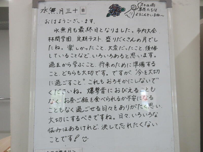 ▼C棟2階のホワイトボード。テスト後の疲れやジメジメした気候もあり、体調を崩している子ども達が多い気がします。健康管理は生きる上で最も大切なこと。自分の健康には十分留意して、今日からの部活動に取り組んで欲しいですね。
