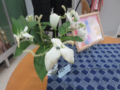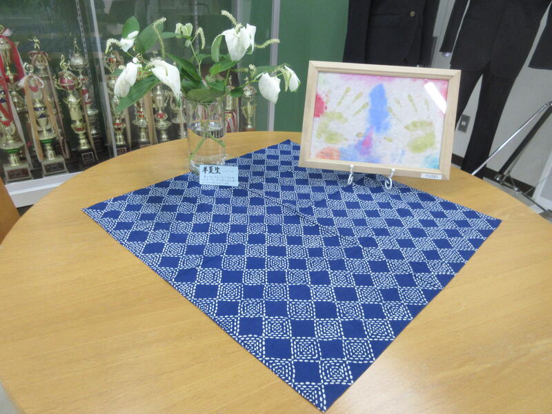 ▼渡辺春子副校長先生が飾ってくださった職員玄関のテーブル。涼しげな雰囲気を感じますね。