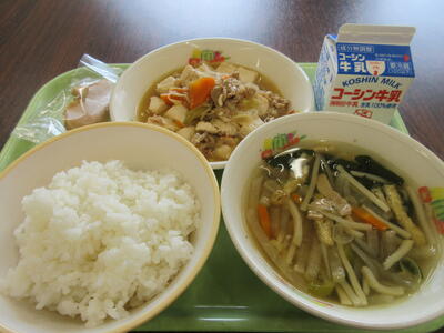 今日の給食は、肉豆腐、沢煮椀、たい焼き、ご飯、牛乳。