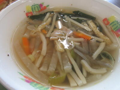 オニオンスープは、オニオンはもちろん、ほくほくのじゃがいもやキャベツ、小松菜、豚肉などのたっぷりの具材からの旨味が凝縮されています。