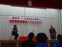また、2部では山田大祐先生と一之輔師匠との対談形式の講演で、一之輔師匠の中学校の時のお話から、落語家になるまでの話をとても楽しく、そして心に残るお話をいただきました。師匠の中学校の後輩にあたる堤先生が登壇したり、早坂先生が「寿限無」を披露したり、大変有意義な時間となりました。生徒からの質問にもわかりやすく答えていただきました。