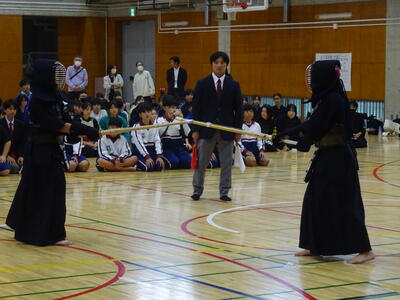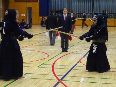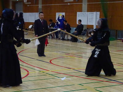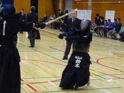 3校のうち2校が次のステージへと駒を進められる予選リーグ、第1試合の相手は野田北部中です!先鋒織田が面を決めて一本勝ち、幸先のよいスタート!続く次鋒春成は相手と互角の戦いを繰り広げますが、試合時間残り1秒で一本を取られ、惜しくも敗れてしまいます。中堅添田も敗れ、1勝2敗。あとひとつ敗れると負け越しが決まってしまう状況に!このピンチに登場したのは副将勝田!試合序盤で面を決め、一本先取します!後半、相手に一本を取り返されますが、すぐさま小手を決めて勝利!2勝2敗となりましたが、この時点で本数差は相手が1本多く、試合に勝利するには勝ちが絶対条件となります!チーム全員の期待を背負って勝負に挑む大将山田、緊迫した試合の後半、合い面を制して一本!3勝2敗でリーグ1勝目を挙げます!