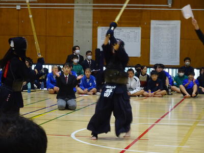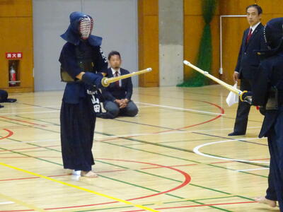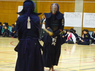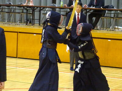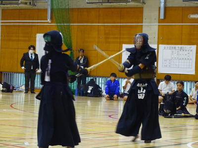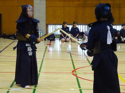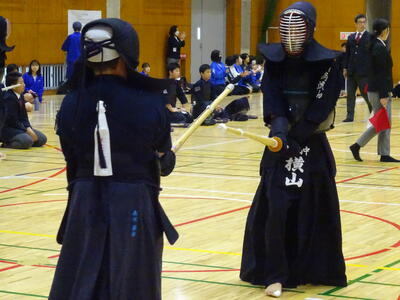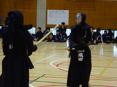 予選リーグ2試合目の相手は流山南部中!先鋒織田、次鋒鈴木と2連勝!中堅、1年生の添田は面を決めて一本を取りますが、二本取られて惜しくも敗れます。副将勝田は二本勝ち、大将山田は引き分けとなり、3勝1敗1分で勝利!予選リーグ1位通過となります!