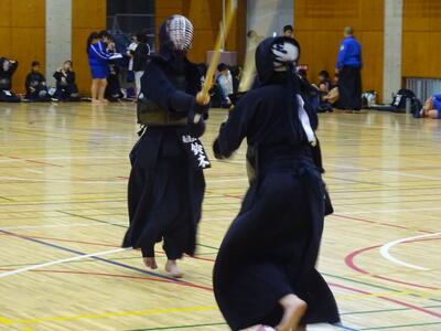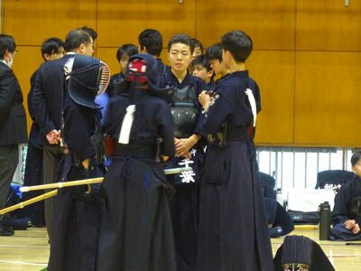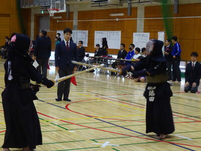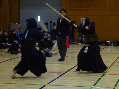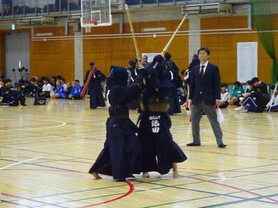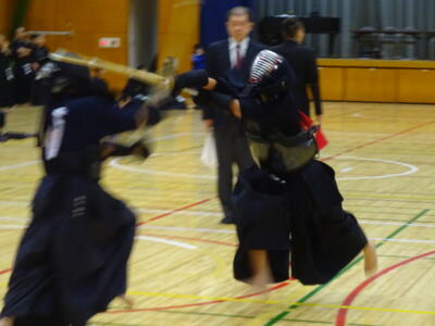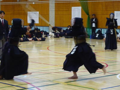 予選リーグは、2校リーグに入ったため、流山北部中との一騎打ち!先鋒、昨日の個人戦でベスト4まで勝ち上がった別所が鋭い面を決めて一本勝ち!中堅鈴木は果敢に攻めるも、二本取られてしまいます。副将千葉は試合開始早々から怒濤の連続攻撃!常に動き回って技を出し続けますが、相手に面を決められ、一本負けとなります。大将の横山は、相手と互角の戦いを続け、引き分け。1勝3敗1分、予選Dリーグ2位で次の試合に進みます。