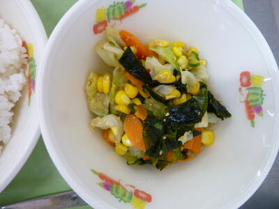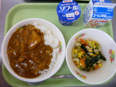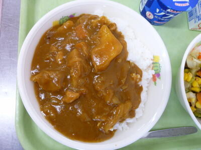 連休明けの給食は、とても元気が出る「チキンカレーライス」でした!!しかし、その陰では調理員の皆さんが、朝から大量の玉ねぎを涙が出るぐらい、頑張って切りながら調理していただいたのでしょう。玉ねぎたっぷりのカレーライスは、とろみも出ていてコクがあり、一口ごとに大満足でした!!サラダは、黄色いつぶつぶコーンとニンジン、キャベツにワカメがたくさん入った、彩りのきれいな海藻サラダでした。ドレッシングもさっぱりしていて、こちらも食べ応え十分な献立でした。今日も、栄養教諭の先生をはじめ、調理員の皆さん、おいしい給食を作ってくださり、本当にありがとうございます!!今週もよろしくお願いします。