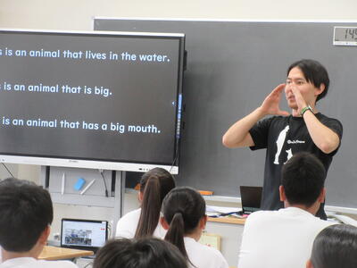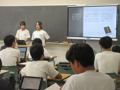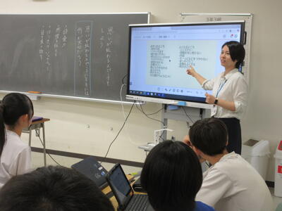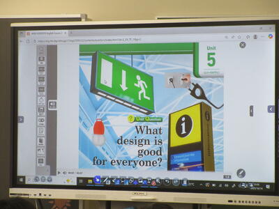 ▼2年生の英語の授業。ここでも電子黒板は授業の必需品です。