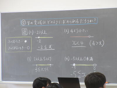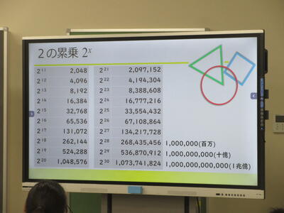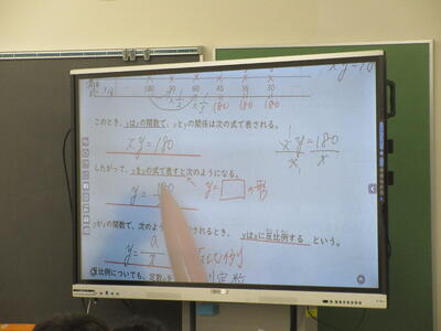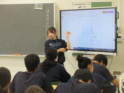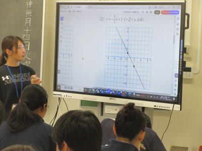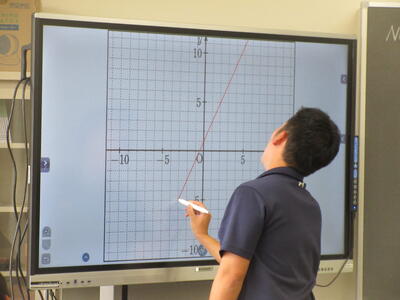 ▼2年生数学の授業。電子黒板はグラフを描くのに実に便利。分かりやすい授業が展開されていきます。