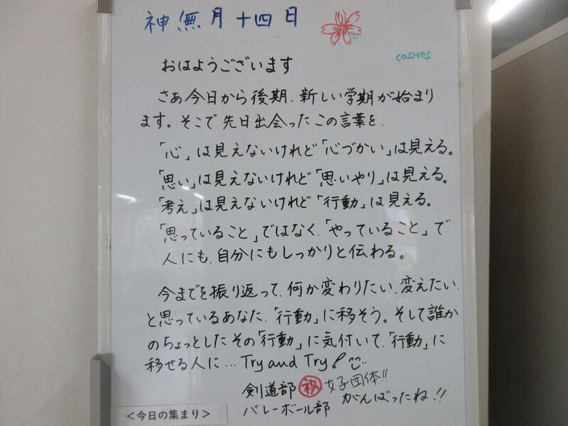 ▼C棟2階のホワイトボード。2学年主任の渡邉久子先生から、子ども達へのメッセージが書かれています。「心づかい」「思いやり」「行動」。子ども達はもちろん、我々大人も生きていく上で、忘れてはいけないことですね。