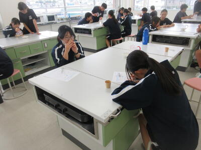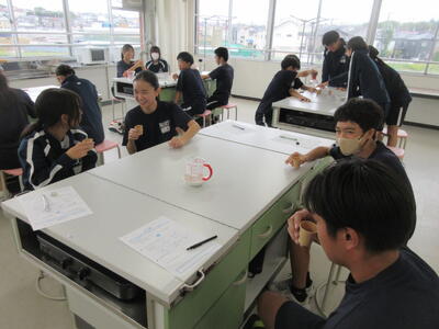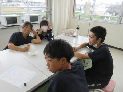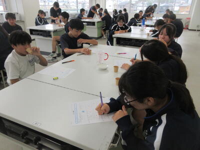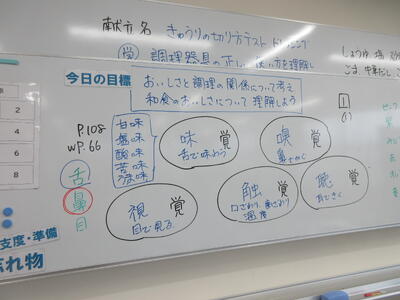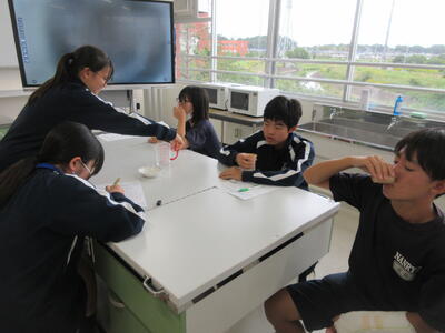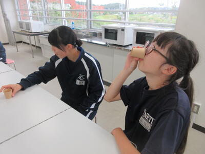 ▼調理室での家庭科「おいしさと調理の関係について考え、和食の美味しさについて理解しよう」がテーマの授業。子ども達は出汁の有無によって味噌汁の味にどんな違いがあるのかを、体験していきます。