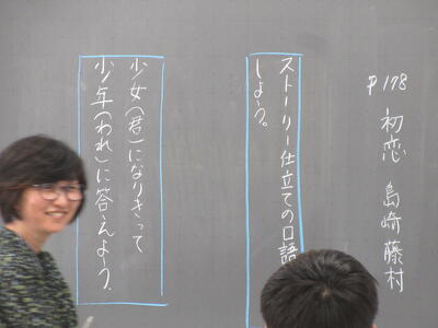 ▼3年1組5校時、宮﨑先生の国語の研究授業。島崎藤村の「初恋」を発展させた学習が行われています。真剣な表情の子ども達です。