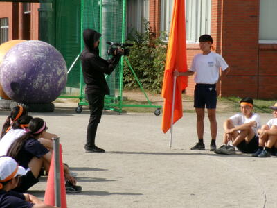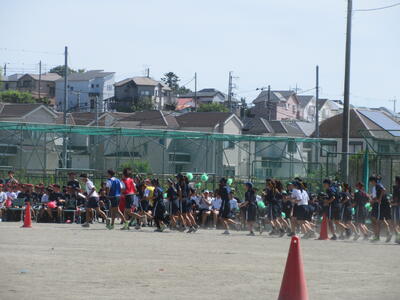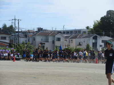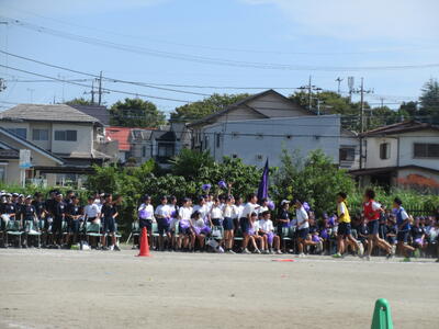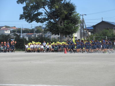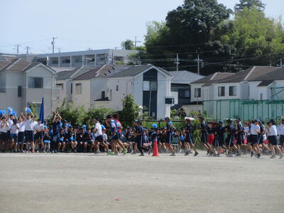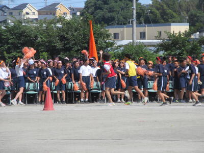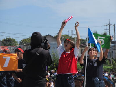 各カラーの代表選手達が颯爽と入場してきます。選手達はトラックを一周。応援席の前を通過すると、子ども達から大歓声が沸き起こります。ここまで各カラーの得点はまれに見る大接戦。このリレーの結果によって勝負が左右されると言っても過言ではありません。第1グラウンドは大変な盛り上がりを見せます。