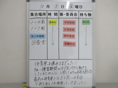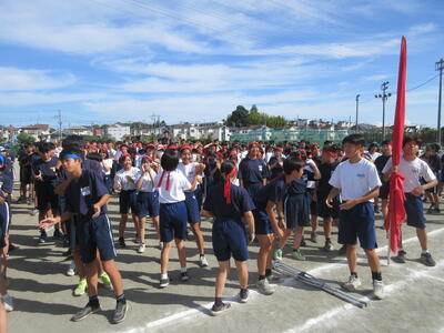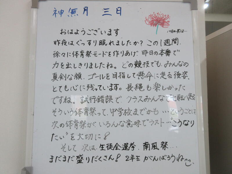 週明け月曜日の南流中。体育祭は終了しましたが、10月は、生徒会役員選、流山市青少年主張大会、東葛駅伝大会、市内音楽発表会、南風祭と大きな行事が目白押し。体育祭で大きな成果を生み出した南流中の子ども達にとっては、まだまだ大きく飛躍する大切な月でもあります。