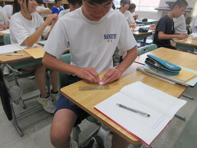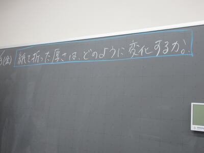 ▼3年生、福田先生の数学の授業。「紙を折った厚さは、どのように変化するか」がテーマの学習です。数学も身近な事柄と密接に繋がっています。