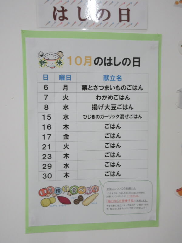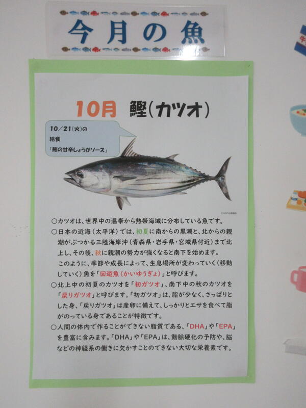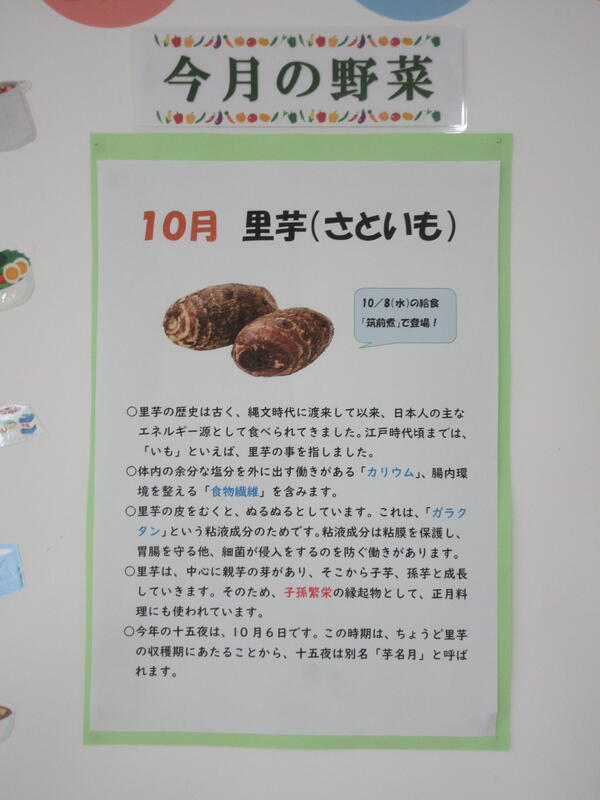 ▼栄養教諭の船渡先生が作成してくださった給食についての掲示物。今月の魚は「鰹」、今月の野菜は「里芋」です。味覚の秋ですね。