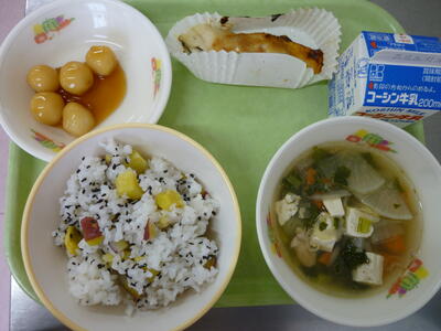 今日の給食は【栗とさつまいものごはん、たらのにんにくみそ焼き、けんちん汁、みたらし団子、牛乳】です。