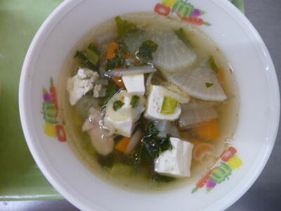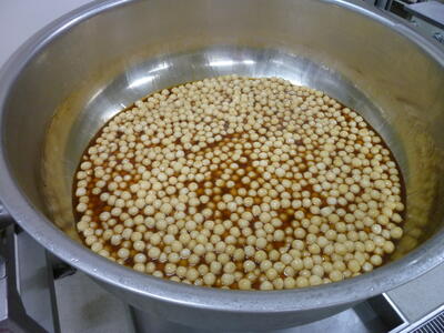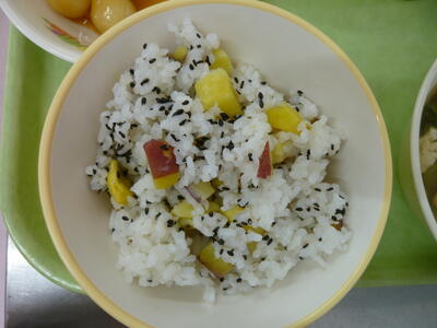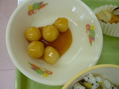 昔から黄色い食べ物は、縁起が良いとされてきましたが、今日のご飯は黄色い食材が2つも入っていて、とてもラッキーな日だと思いました!!そして、待望の「栗とさつまいものごはん」は、ほんのりと優しく甘い味でした。黒ごまの中に、栗とさつまいもが仲良くたくさん入っていて、最後までおいしく楽しくいただきました。このごはんにピッタリのおかずだったのが、「たらのにんにくみそ焼き」です。香ばしいみそだれに、カリッと焼きあげられたたらの切り身は、ごはんがとってもすすみました。「けんちん汁」は、野菜と鶏肉など具だくさんで醤油ベースでした。さっぱりとした味付けで、ごくごくと飲み干してしまうほど、とても食べやすい汁物でした。デザートは、お月様のようなみたらし団子で、口に入れると醤油だれが甘じょっぱく広がって、とても満足感がありました。今日も最高の給食を作ってくださった栄養教諭の先生、調理員の皆さん、ありがとうございました!!