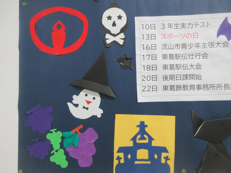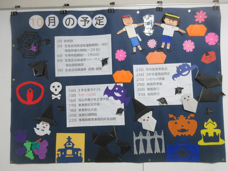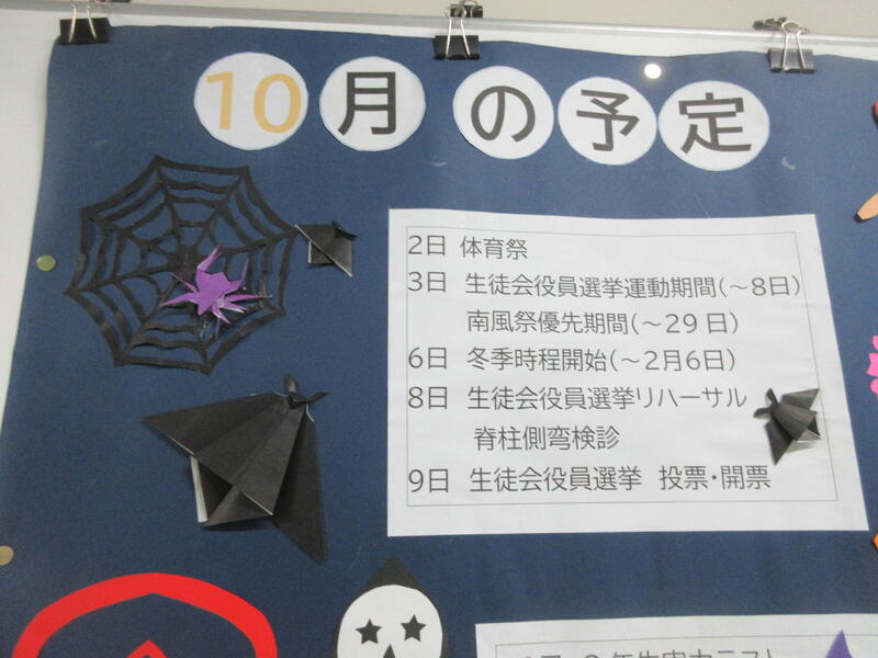▼A棟の掲示板には、ひまわり学級作成の可愛らしい「10月の予定」が子ども達をお出迎え。