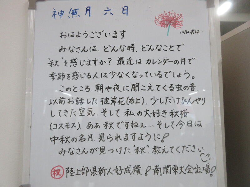 ▼C棟2階のホワイトボード。2学年主任の渡邉久子先生から「秋」についてのメッセージが書かれています。一人ひとりの「秋」の感じ方にも違いがありますよね。