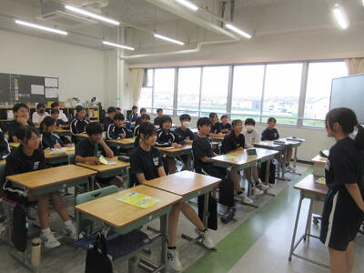 ▼帰りの会の時間。生徒会役員選挙の演説に各クラスを回る子ども達。中学生と言ってもあと数年で選挙権を持ちます。民主主義を学ぶ大切な機会です。