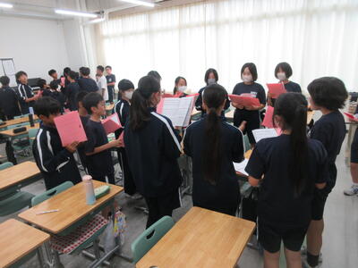 ▼2年生の教室や廊下からも素敵なハーモニーが聞こえてきます。つい先日、「最高の体育祭」を創り上げた子ども達。ここで得た団結力で今度は、各学級での最高の合唱創りへと舵を切っていきます。