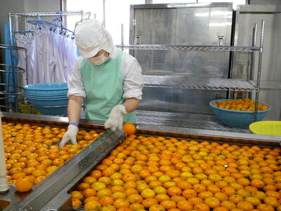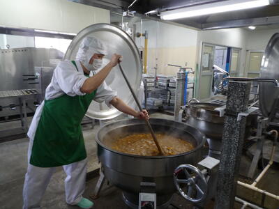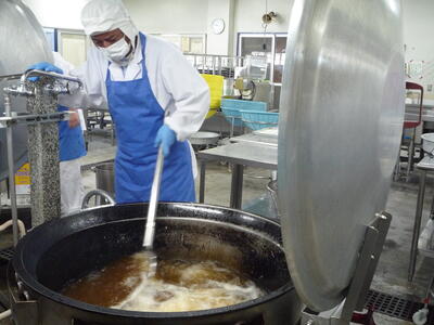 トマト煮を配缶しているところ。子ども達がたくさん食べてくれることを想像しながら丁寧に行っています。
