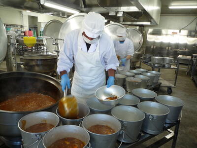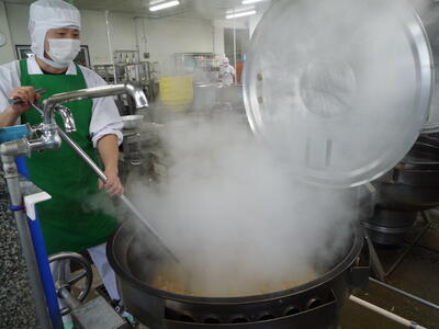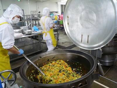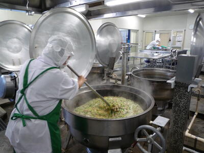 豚キムチ丼に使うキャベツを切っているところと中華スープを配缶しているところ。手間のかかる作業も、力仕事も全て調理員さんが丁寧に行ってくださっています。
