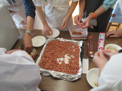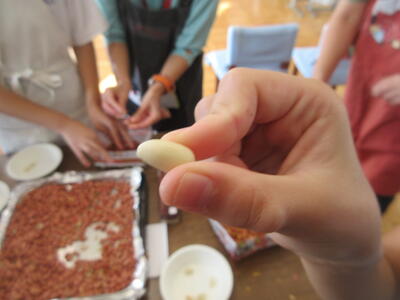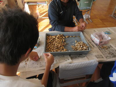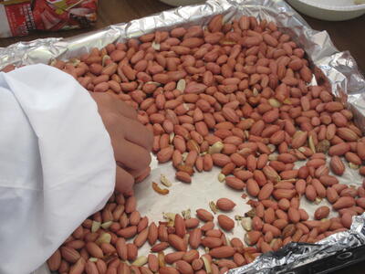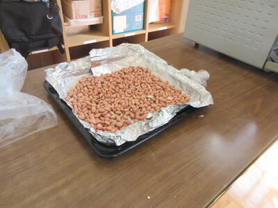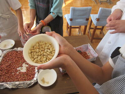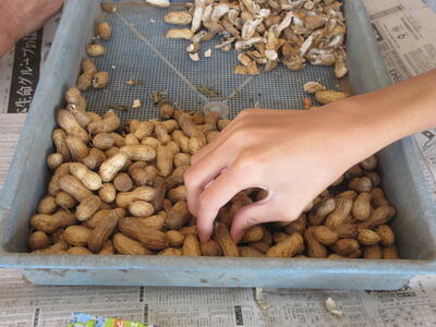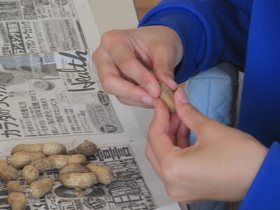 6月にひまわり学級で植えた落花生がめでたく収穫されたのが10月。その後、乾燥をさせた落花生が、やっと食べられることになりました。まずは、落花生の殻から中のピーナッツを取り出します。取り出したピーナッツの薄皮を取ります。中からは、キレイな色のピーナッツが出てきます。