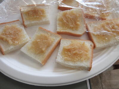 セサミトーストのごまペーストを作っているところ。ペーストは、バター、マーガリン、グラニュー糖、すりごまをあわせて作っています。さらに、全部で1170枚の食パンに、1枚1枚手作業でセサミペーストを塗っているところ。