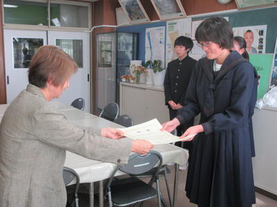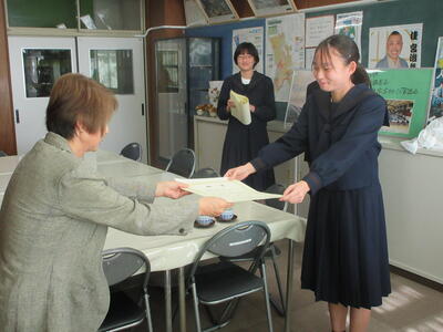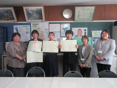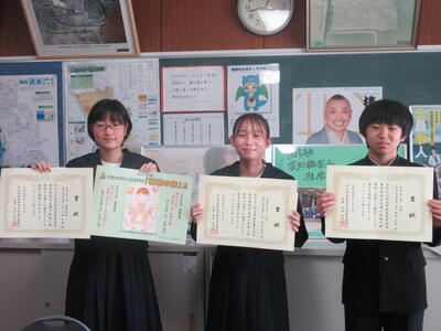 市内中学校10校、2,370点の応募の中から、大田七海さんが最優秀賞、松田唯衣さん・木村多喜くんが佳作(全応募の中で5点)