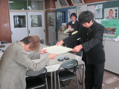 11月1日(水)昼休み、流山市民生委員児童委員協議会の主催で毎年行われる、「児童虐待防止標語『家族の絆』」において、優秀な作品を出品した3年生3名の表彰が行われました!