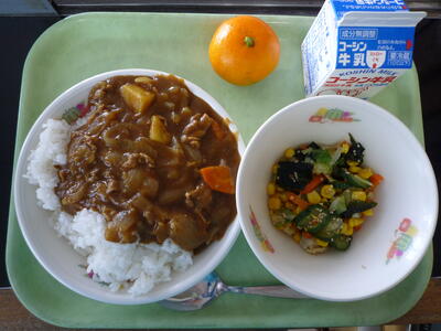 今日の給食は、さつまいものカレーライス、海藻サラダ、みかん、牛乳。