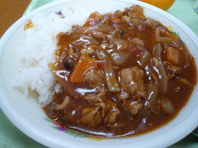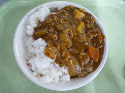 今日のカレーライスは、じゃがいもではなく、「さつまいも」が使われています。千葉県産のシルクスイートという品種です。秋の深まりを感じます。辛さとコクのあるルーと、溶け出した具材の旨味とさつまいもの甘さが調和した至極の逸品です!