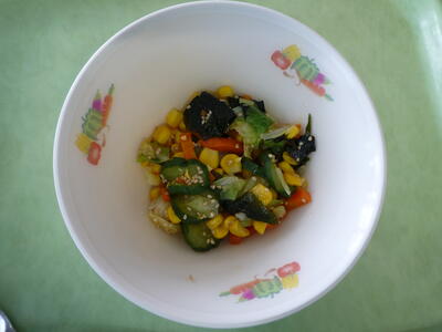 にんじんの赤、コーンの黄、きゅうりとキャベツとわかめの緑(青)がとても色鮮やかな海藻サラダは、シャキシャキした歯応えが良く、とても美味しかったです。