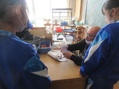 美術の授業では3年生の子ども達が、卒業記念用の絵皿の作成を行っています。熱中する子ども達の姿はまるで本物の芸術家のよう。