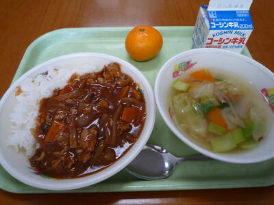 今日の給食は、ごはん、根菜酢豚、春雨スープ、みかん、牛乳。