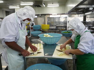 チキンポトフのかぶを一つ一つ手で切っていきます。かぶの量は約20㎏、量も多く大変時間もかかります。それでも子ども達のため懸命な作業が続きます。