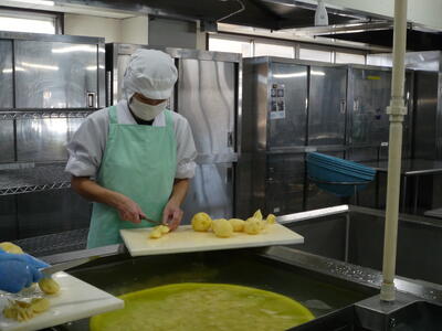 トマト煮に使う玉ねぎ(38㎏)とじゃがいも(65㎏)を切っているところ。味付けは、砂糖、ケチャップ、中濃ソース、塩、こしょうで行っています。
