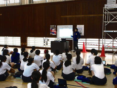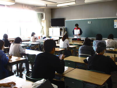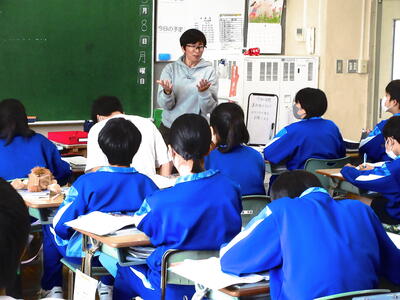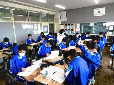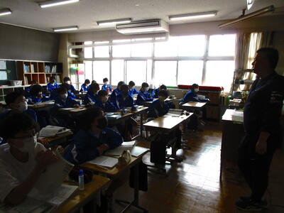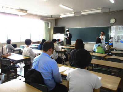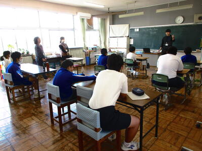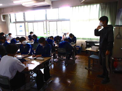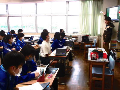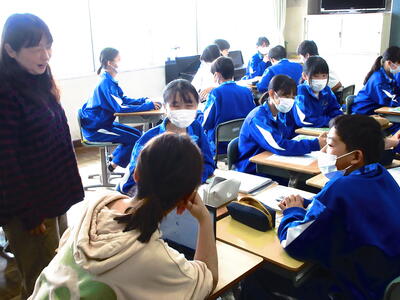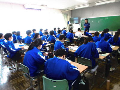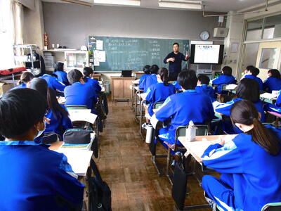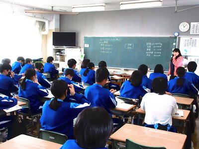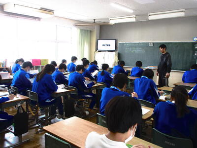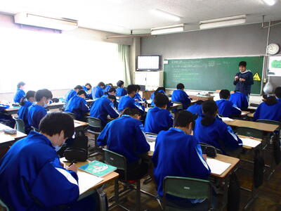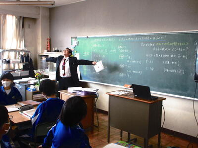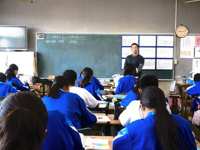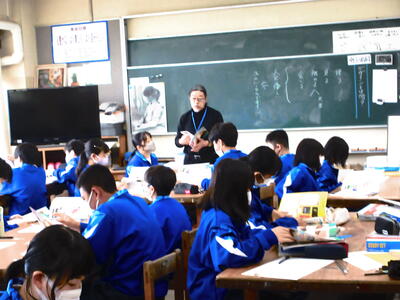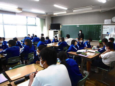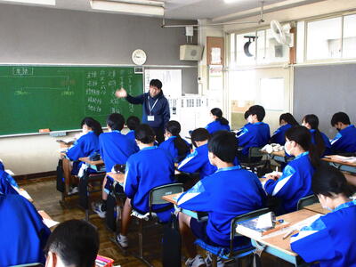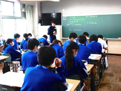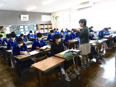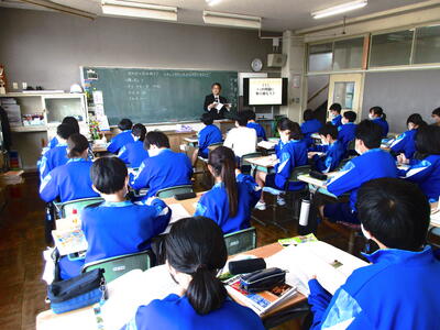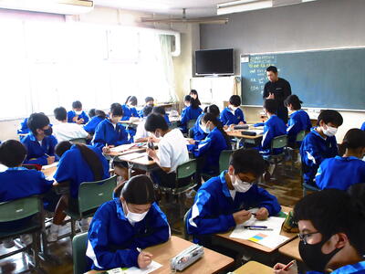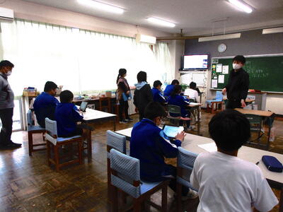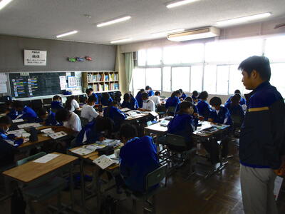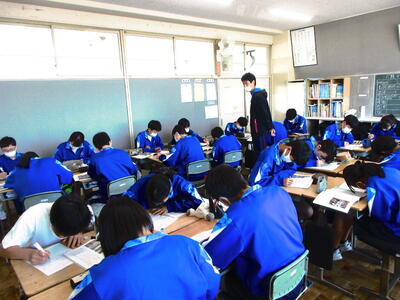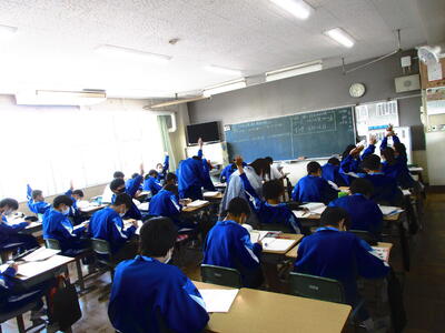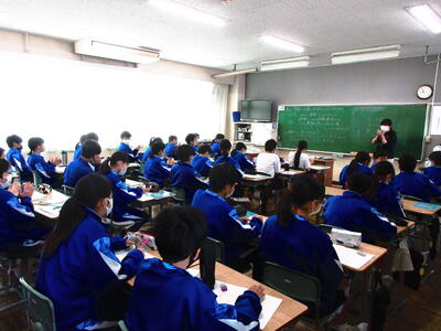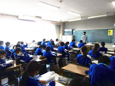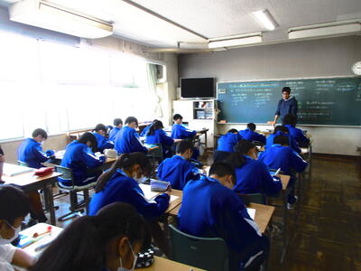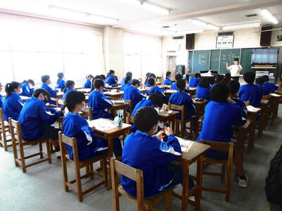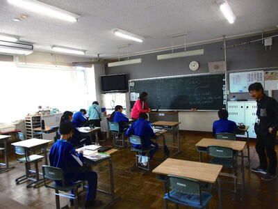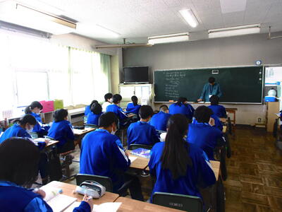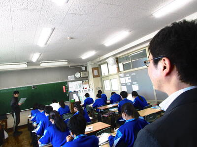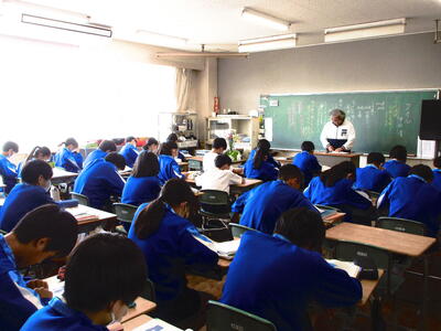 おいしい給食を食べた後の5時間目、近隣の千葉県立流山南高校の校長先生が来校され、3年生を中心に授業をご覧いただきました。