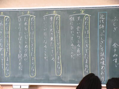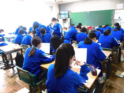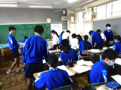帰りの会は子ども達の素晴らしい歌声があちこちのクラスから聞こえてきます。1年生は「校歌」、2年生は「南風」、3年生は「ふるさと」。南流中全体が子ども達の温かい歌声に包まれています。