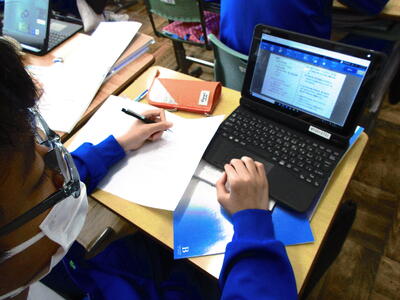 数学ではタブレット端末を活用した授業も積極的に行われています。子ども達も慣れたもの。タブレット端末のみならず、電子黒板、従来からある黒板など、必要に応じて様々な教材教具を使って学習が進められています。