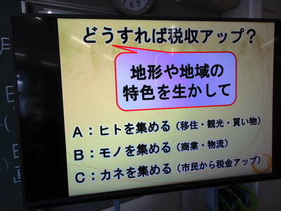 教頭先生の授業では電子黒板に「どうすれば税収をアップ?」という難題が提示されています。統一地方選も終了し、全国から注目を集める流山市に住んでいるわけですから、政治や行政に興味を持つ子どももいるかもしれません。子ども達の前に立つ教頭先生の表情や動作が、いつも以上に生き生きと見えるのは気のせいでしょうか?