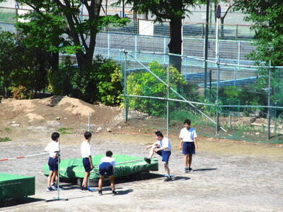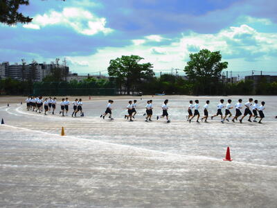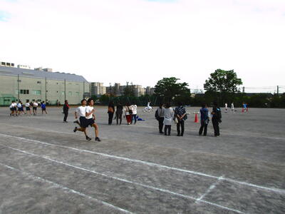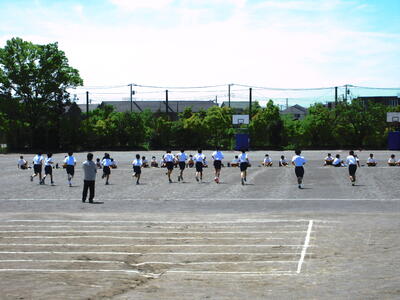 一方トラックではウォーミングアップでジョギングをする生徒達の姿。その後「♪ドレミファソラシド ドシラソファミレド」の楽しげな音とともに、あのハードな「シャトルラン」が行われていました。子ども達は自分の限界に一生懸命チャレンジしています。