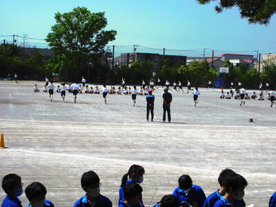 3校時の校庭をのぞくと3年生が「シャトルラン」、1年生が男子は1500m走、女子が1000m走に臨んでいました。