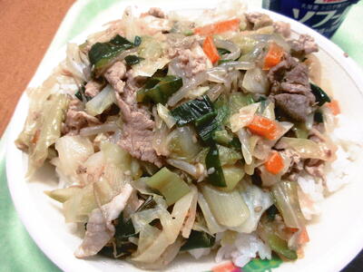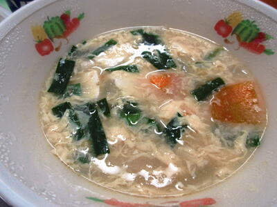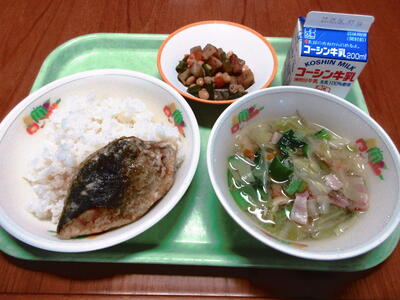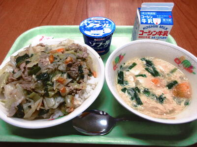 今日の給食は、ごはん、たくあんとじゃこのふりかけ、豚肉と厚揚げの味噌炒め、かき玉汁、牛乳。