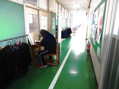 一方2年生の廊下には、担任する学級の廊下に机と椅子を出し、大きな体を小さくしてスタディライフにコメントを書いている先生の姿がありました。子ども達の学習面だけでなく、生活面、心の面にまで注意を払う先生の思いに頭が下がります。