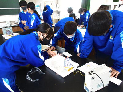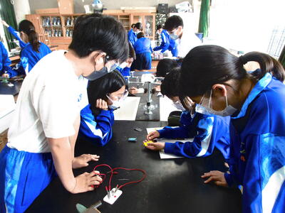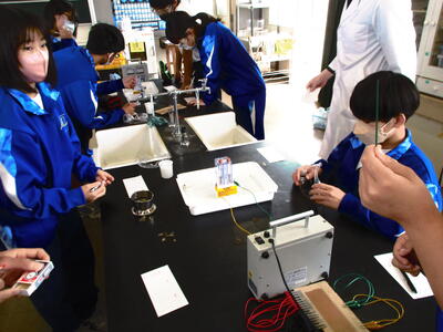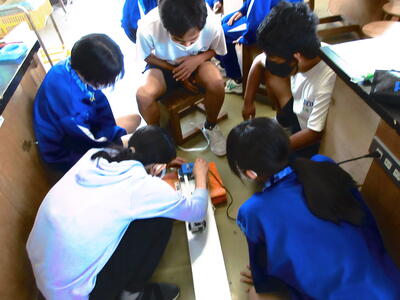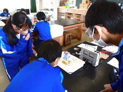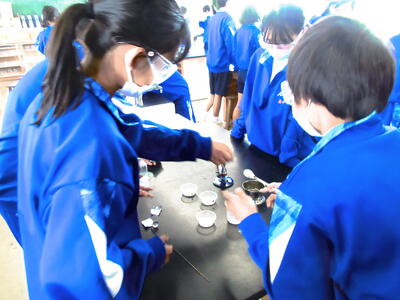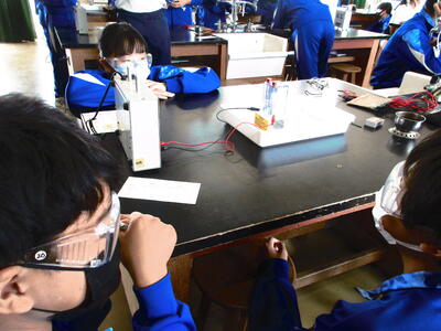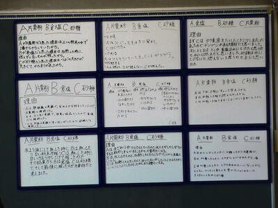 理科では、食塩か砂糖か小麦粉かグループごとに実験で確かめる授業が行われています。お互いにコミュニケーションをとりながら課題に取り組んでいます。