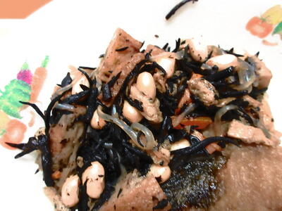 本日の給食は、あじのかば焼き丼、五目煮、ベーコンのみそ汁、牛乳という和食メニューでした。