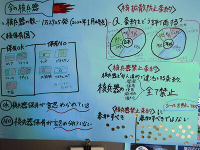 日本国憲法前文と第9条が黒板に貼られた教頭先生の社会の授業では、ペアとなって自分の言葉で課題を説明する「ペアトーク」が始まります。今回のテーマは「なぜ、世界は核兵器を手放せないでいるのか?」と「核抑止とは?」の2つ。大人でも難しいテーマに3年生は懸命に臨んでいます。
